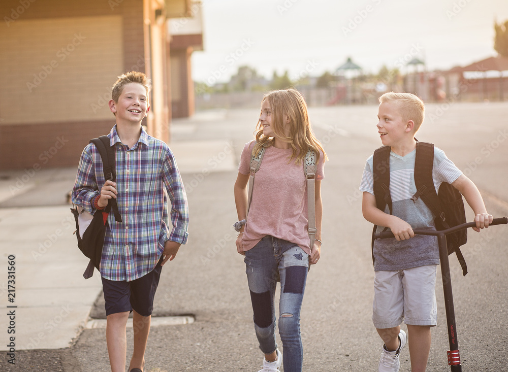 Candid Photo of a group of smiling elementary school students in the playground after school. Back to school concept photo. Real kids walking home from school and having fun