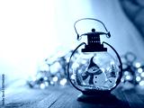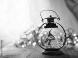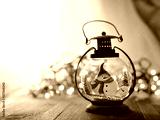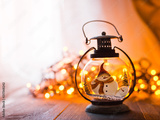glass lantern with burning candles Christmas presents and a glowing garland on a wooden table. free space for text and congratulations. mocap