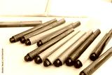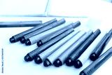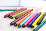 Multicolored marker pens, office and school drawing art design. Blurred notebook and ruler on background.