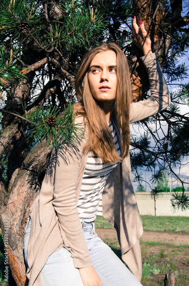 Pretty and sexy model sitting on the tree and posing on the camera. The girl looking sideways. Young woman wearing white jeans, crem jacket and striped T-shirt. Outdoor. Medium Shot.