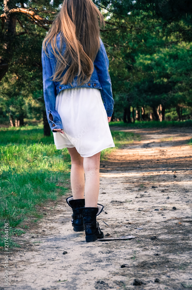 The girl walking on the contryside road in wood. Young woman with long blond hair dressed in white dress and blue jeans jacket and wearing black boots. View from back. Outdoor. Walk.