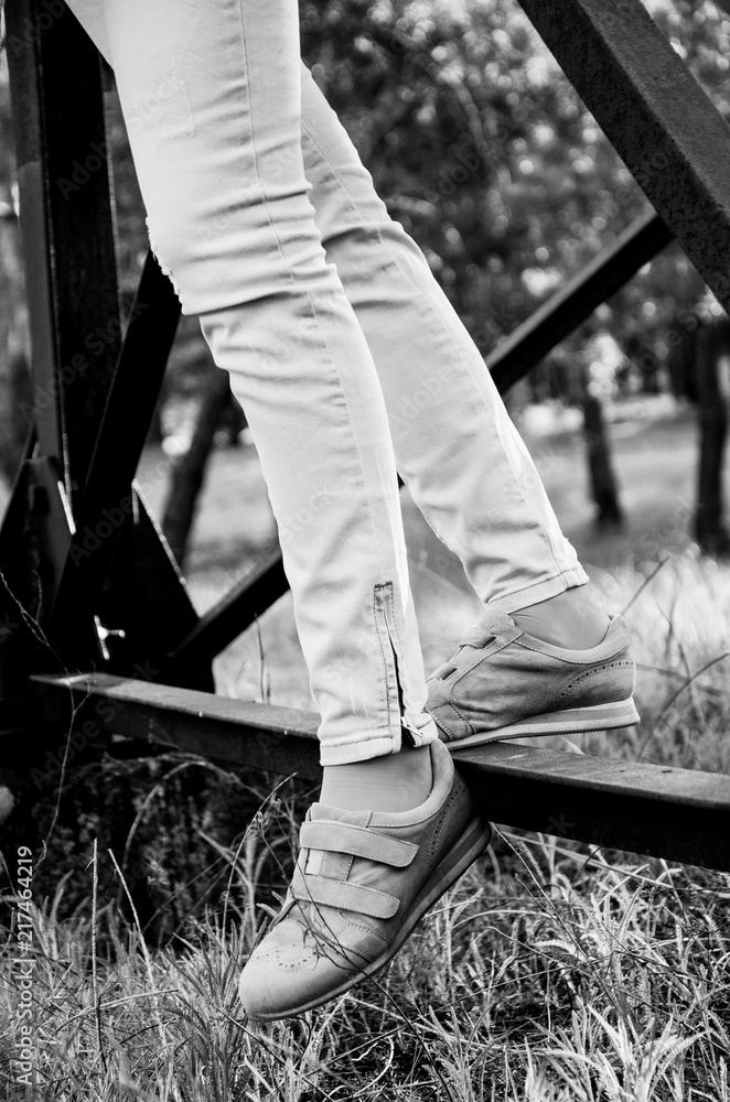 The young woman standing on the iron construction. Legs of a model. Woman dressed in jeans and sneakers