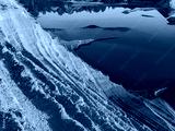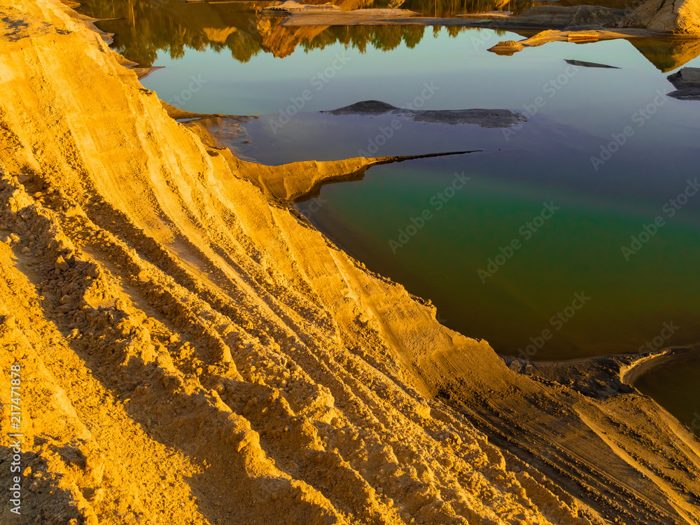 A view from above on a sandy quarry filled with water. photo from a drone. water is green. yellow sand at sunset. picture for the background.