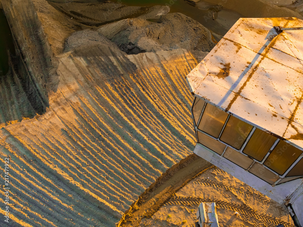 top view of the sand pit. photo from a career tractor. yellow sand at sunset. sand with drawings. picture for the background. tractor tracks