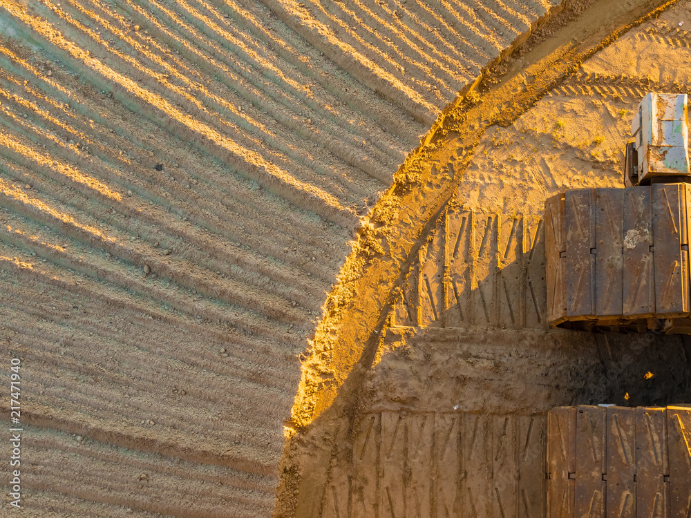 top view of the sand pit. photo from a career tractor. yellow sand at sunset. sand with drawings. picture for the background.