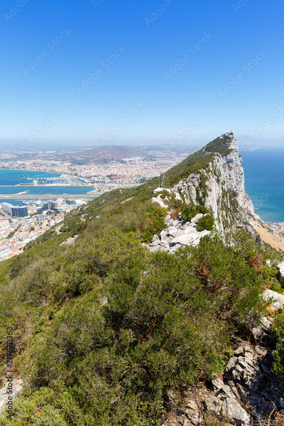 Gibraltar Affenfelsen Felsen Fels The Rock Hochformat Meer Mittelmeer Urlaub Übersicht Stadt