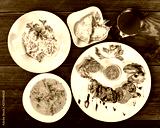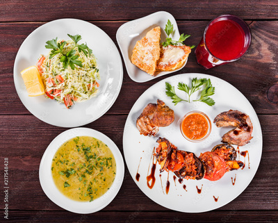Delicious dinner table with grilled meat and vegetables, fresh vegetables salad, chicken soup, toast with cheese and compote