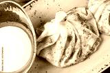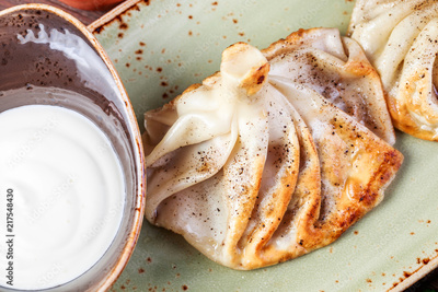 Traditional russian pelmeni, ravioli, dumplings with meat in plate on wooden background. Parsley, sour cream and spices
