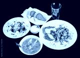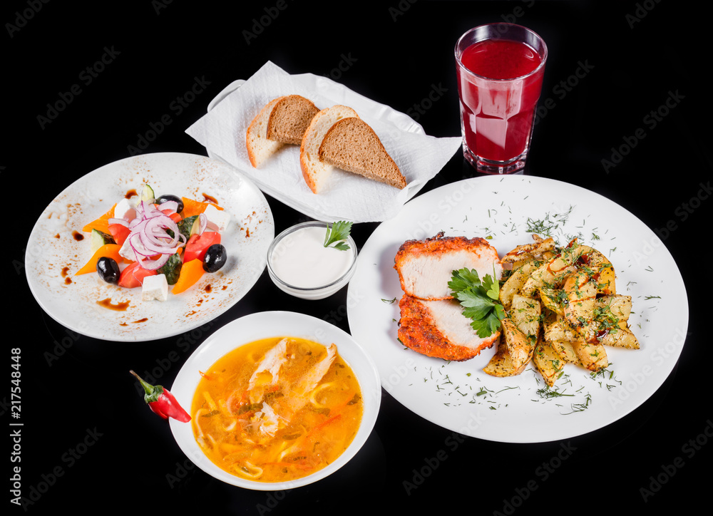 Delicious dinner table with baked chicken breast and potatoes, fresh greek salad, chicken soup, bread and compote