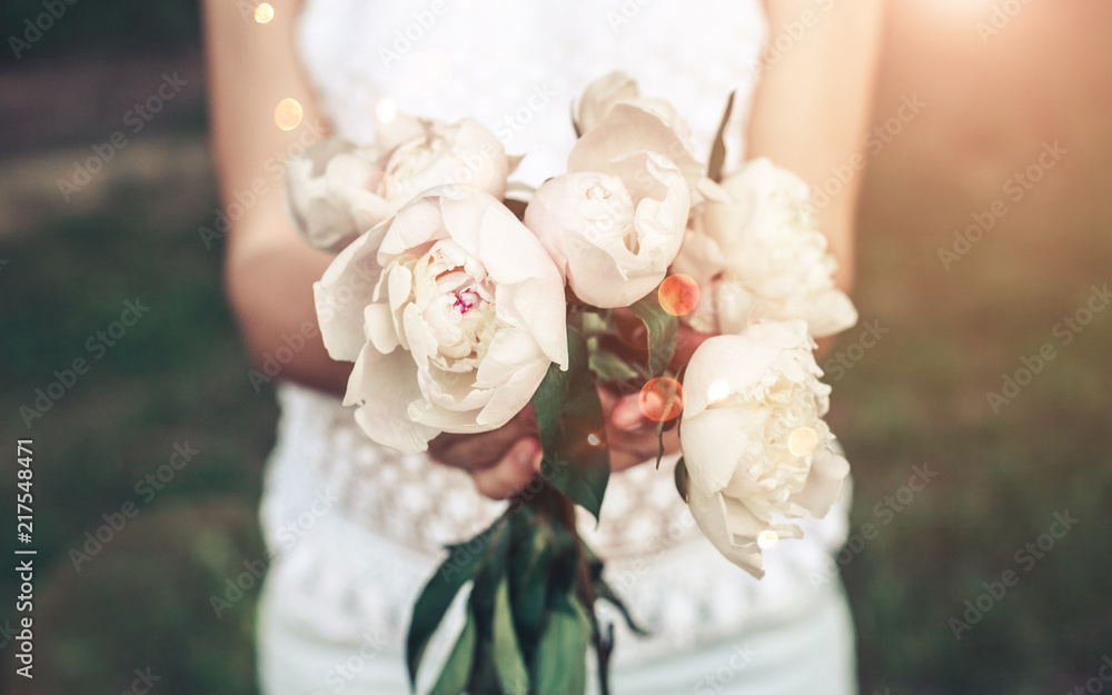 Girl's hands holding bouquet of peonies flowers on outdoor. Selective focus. Toning