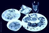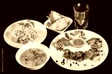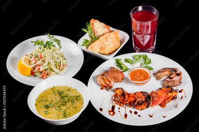 Delicious dinner table with grilled meat and vegetables, fresh vegetables salad, chicken soup, toast with cheese and compote