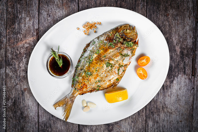 Grilled dorado fish with greens and lemon on wooden background. Top view. Healthy food. Top view