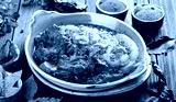 Baked meat with grilled vegetables, potatoes, greens in plate on wooden background. Hot Meat Dishes