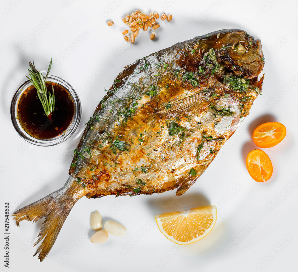 Grilled dorado fish with greens and lemon on black background isolated. Healthy food. Top view