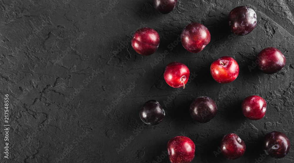 Fresh plums pattern on dark stone background. Healthy summer fruits. Top view, flat lay, copy space