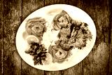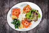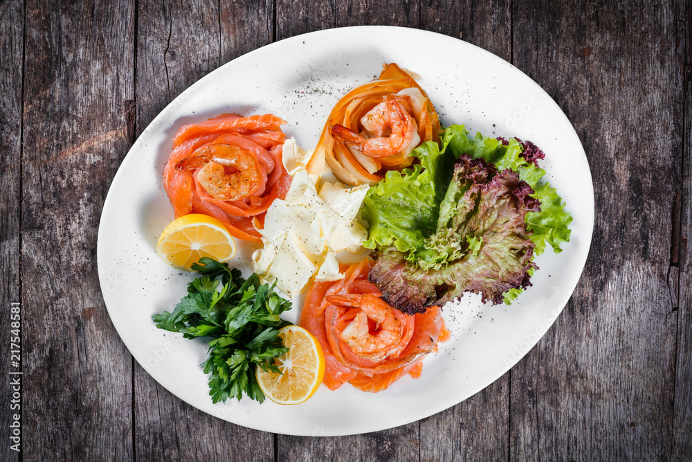 Seafood platter with salmon slice, pangasius fish, shrimp, decorated with lemon and greens on wooden background