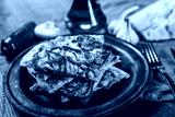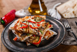 Sliced pizza with chicken, zucchini, eggplant, pepper, cheese and mushrooms on the plate vintage. Top view. Toning