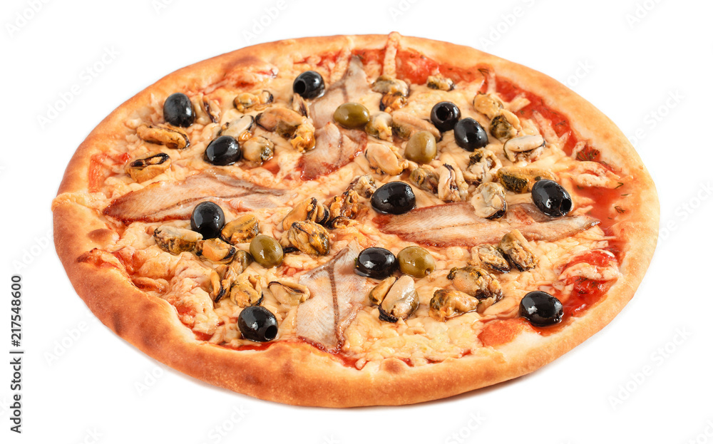 Pizza with fish eel, mussel, black and green olives, cream cheese isolated on white background. Italian cuisine
