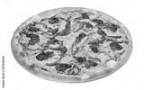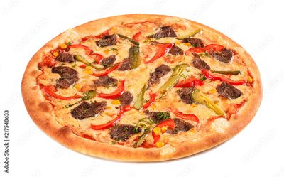 Pizza with beef, sweet pepper, cucumber, sweet corn, cheese and greens on white isolated background. Italian cuisine. Top view