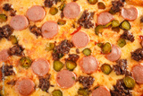 Pizza with ground beef, sausage, cucumber and cheese isolated on white background. Italian cuisine