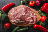 Raw meat, beef steak on cutting board on black background with ingredients for cooking. Top view