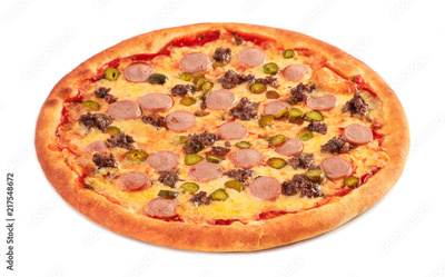 Pizza with ground beef, sausage, cucumber and cheese isolated on white background. Italian cuisine