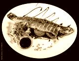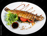 Grilled sea fish with greens and lemon on black background isolated. Healthy food. Top view