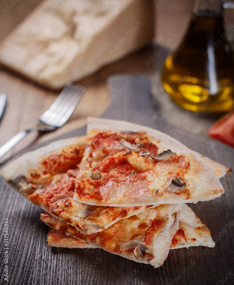 Sliced pizza with ham, cheese, mushrooms and tomato sauce on wooden cutting board. Top view