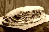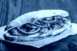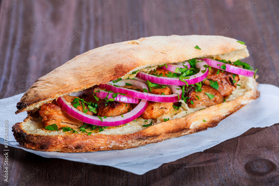 Grilled chicken in sandwich from fresh pita bread with onion and greens on dark wooden background. Shashlik or Shish kebab.