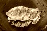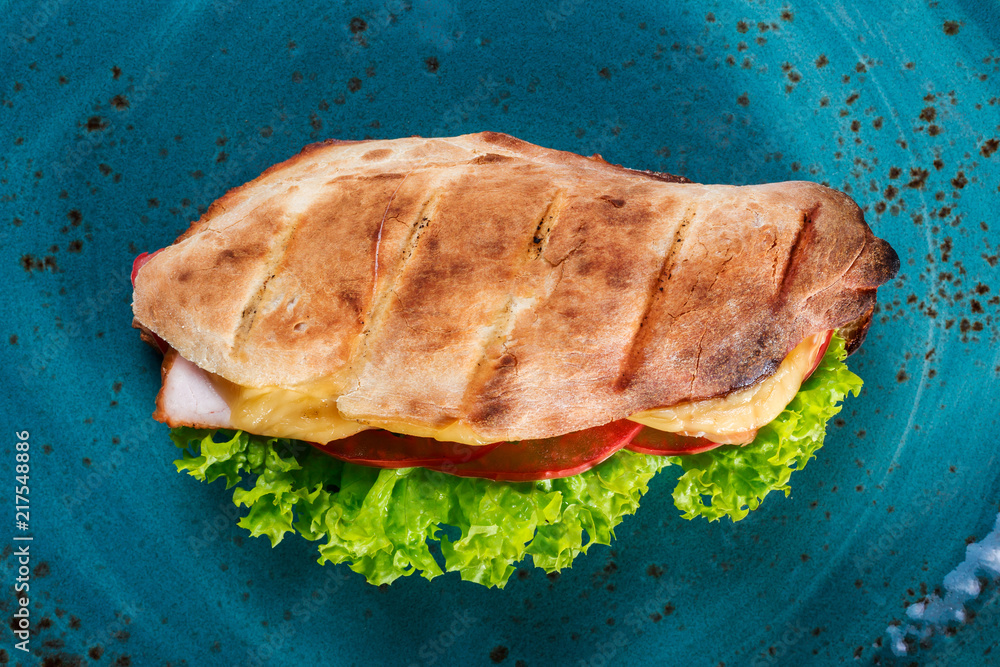 Sandwich from fresh pita bread with lettuce, slices of fresh tomatoes, ham pork and cheese on dark wooden background.