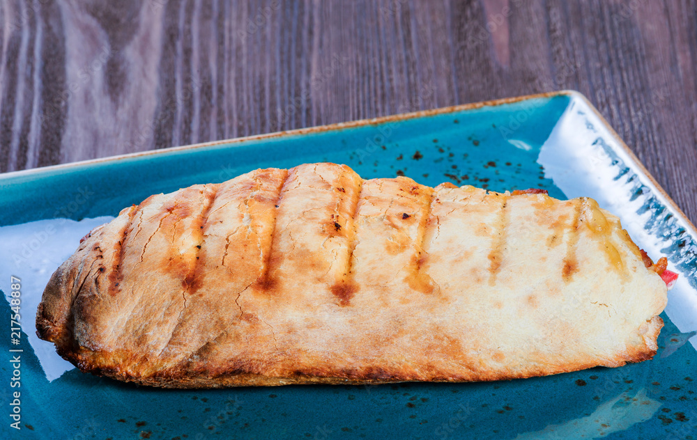 Sandwich from fresh pita bread with fillet grilled chicken, lettuce, slices of fresh tomatoes, pickles and cheese