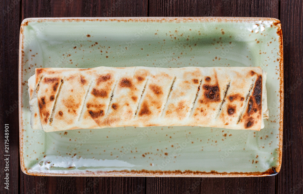 Burrito wraps from fillet grilled chicken, pickles, tomatoes and cheese on dark wooden background. Shashlik or Shish kebab