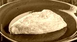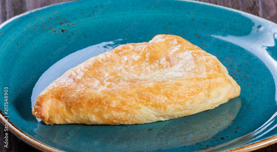 Georgian khachapuri flatbread or flat cake with cheese on a plate Homemade baking. Top view