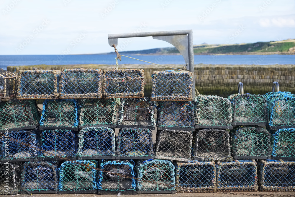 Stack of lobster net pots at harbour by stone wall for fisherman to catch sea fish and food