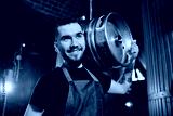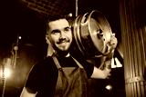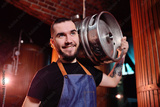 a young handsome male brewer holds an iron barrel with beer on the background of the brewery and beer tanks