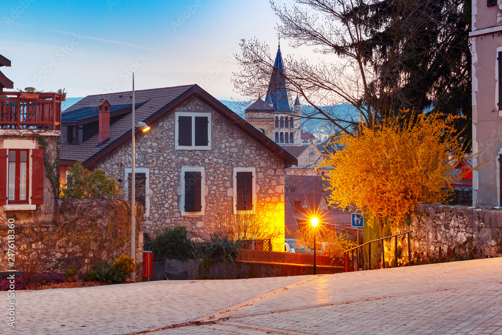 Typical French houses in Old Town of Annecy during morning blue hour, France