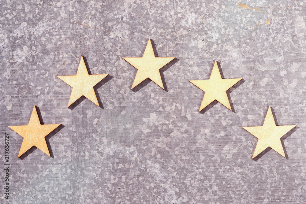 Five wooden stars on a tin plate background. Concept of service rating and quality of trade .