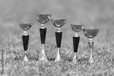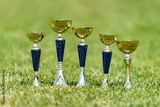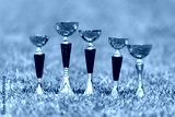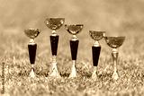 Five golden trophy in green grass