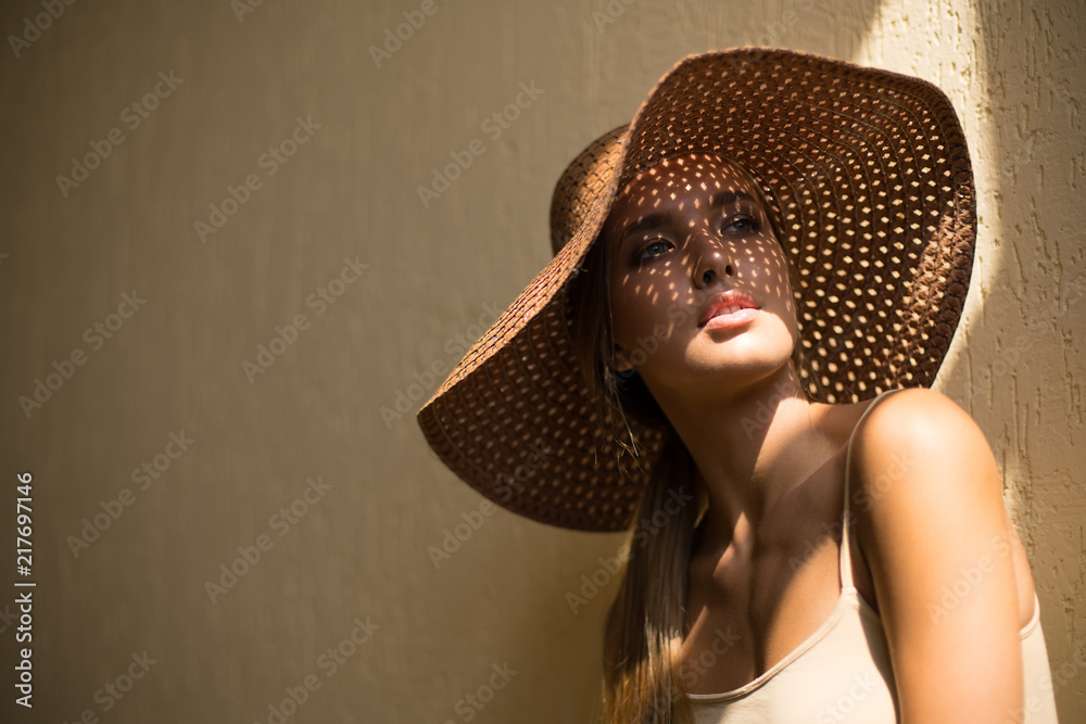 Close-up Fashion woman portrait of young pretty trendy girl in hat posing at the city, summer street fashion.