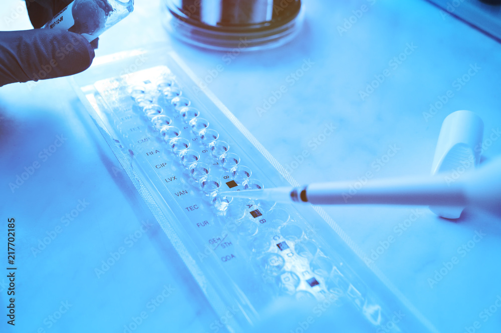 scientist or laboratory assistant with a pipette or dispenser in the hands of a bacteriological laboratory of a bacteriological laboratory