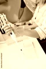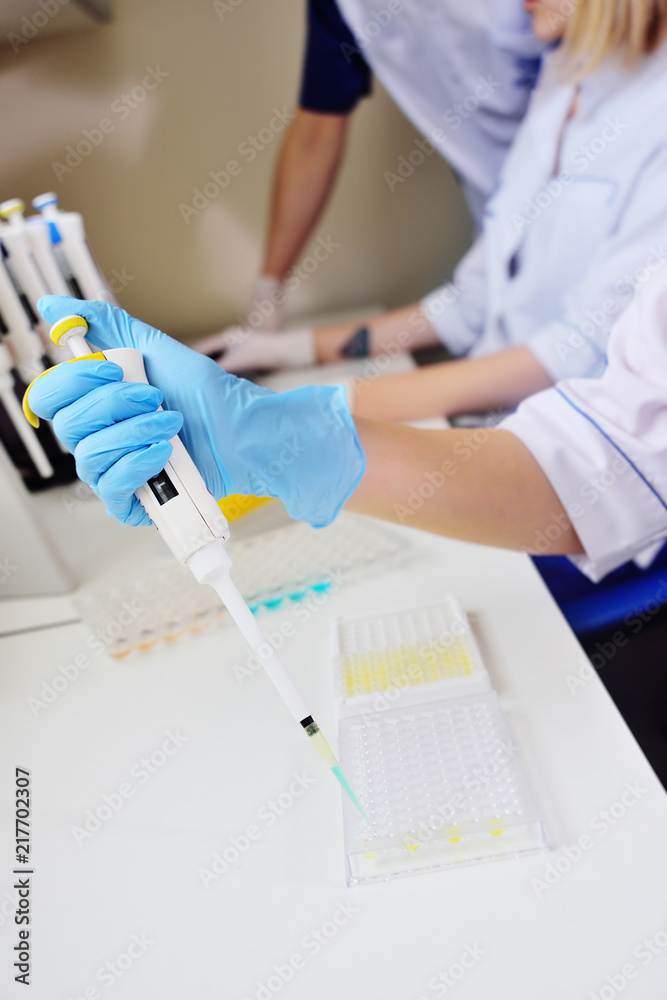 A scientist in a medical laboratory with a dispenser in his hands is doing an analysis