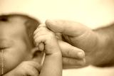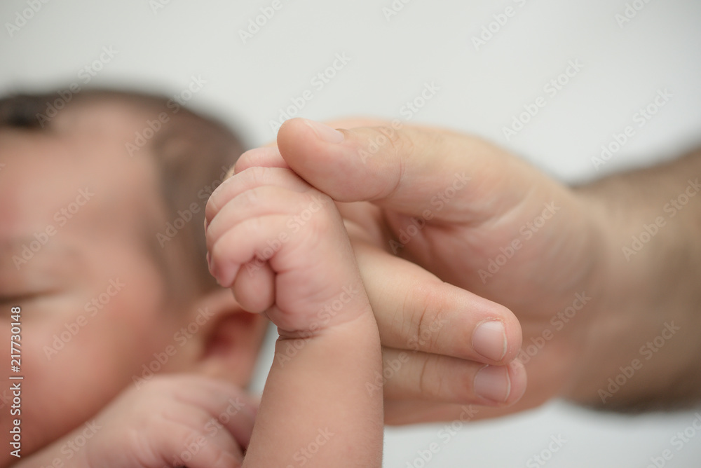 Newborn baby holding finger of mother / father. Happy Family and Baby protection concept. Mom and dad holding the hand of their child.