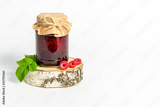 Jar with jam of raspberries wrapped in wrapping paper, stands on a birch stump on white background, on white background