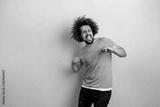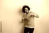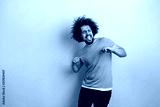 A curly-headed handsome man wearing a gray T-shirt is standing with a cheerful smile and dancing with his eyes closed over the blue background.