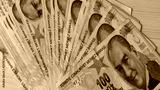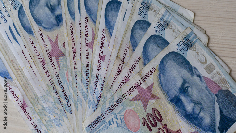 Turkish Lira decreased in value, losing value, depreciation. Turkish government paper banknotes, stock exchange. Closeup of Turkish national currency known as "Turk Lirasi" on white background.