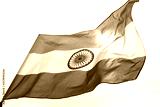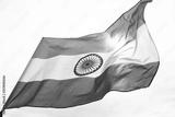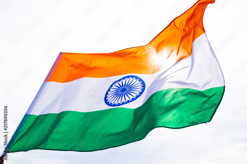 Close up man hand holding India flag on the blue sky background. Indian Independence Day, 15 August.