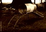 Old rusted playground, abandoned aged swings, destroyed childhood, damages in attraction park, war and poverty concept