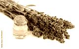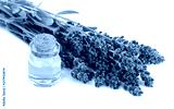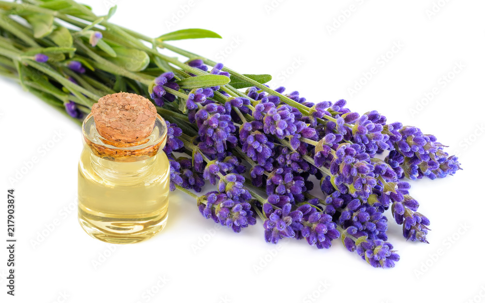 Lavender oil in transparent glass bottle with lavender flowers on a white background.