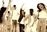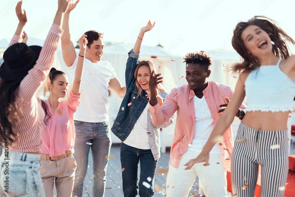 Pleased girls and positive men dancing and jumping while gesticulating hands outside
