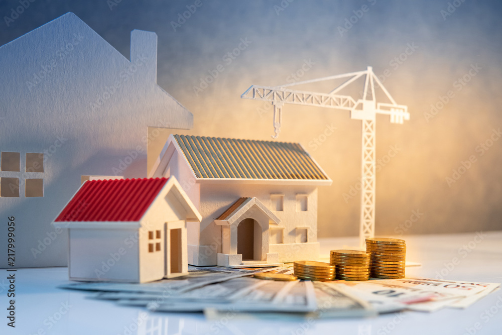 Real estate or property development. Construction business investment concept. Home mortgage loan rate. Coin stack on international banknotes with house and construction crane models on the table.